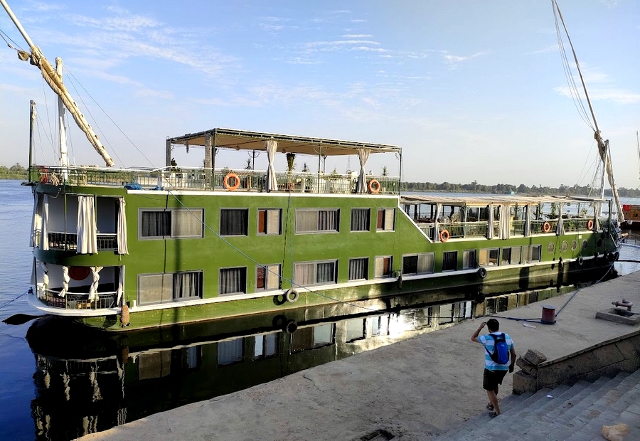 Nuestra dahabeya era la que se ve en la foto (ahí aparece amarrada en el muelle de Edfú con uno de los redactores a punto de abordarla) y estaba operada por la compañía local Veda-Egypt, Resultó perfecta tanto por el viaje en sí como por la magnífica atención y trato por parte de la tripulación de a bordo.