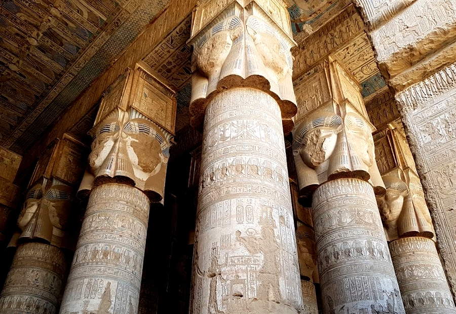 A 100 Km siguiendo el curso del río hacia Luxor se halla la ciudad de Dendera y el templo homónimo. Sin duda, el templo de Dendera es una de las mayores maravillas que se pueden visitar en Egipto, hasta el punto que para muchos de los visitantes llega a superar en belleza y majestuosidad incluso al imponente templo de Abu Simbel o al gigantesco complejo de Karnak. Se trata de un vasto conjunto de templos y edificaciones entre los que destaca el bellísimo templo principal. Es de época grecorromana y está perfectamente conservado debido a que se descubrió enterrado en la arena casi en su totalidad. Está dedicado a la diosa Hathor, aspecto que queda de manifiesto en la espectacular sala hipóstila. Ante sus esbeltas de columnas de capitel hathoriano todo el mundo queda embelesado sin remedio y es normal ver a la gente vagar entre ellas extasiada o sentarse en una esquina para captar toda su magnificencia. Una vez superada la sala de columnas pudimos visitar el resto del templo, incluidas la terraza y las estancias de los sacerdotes, con sus correspondientes relieves e imágenes, una de ellas la de la famosa y misteriosa lámpara de la que aún no se tiene una explicación clara de lo que representa.