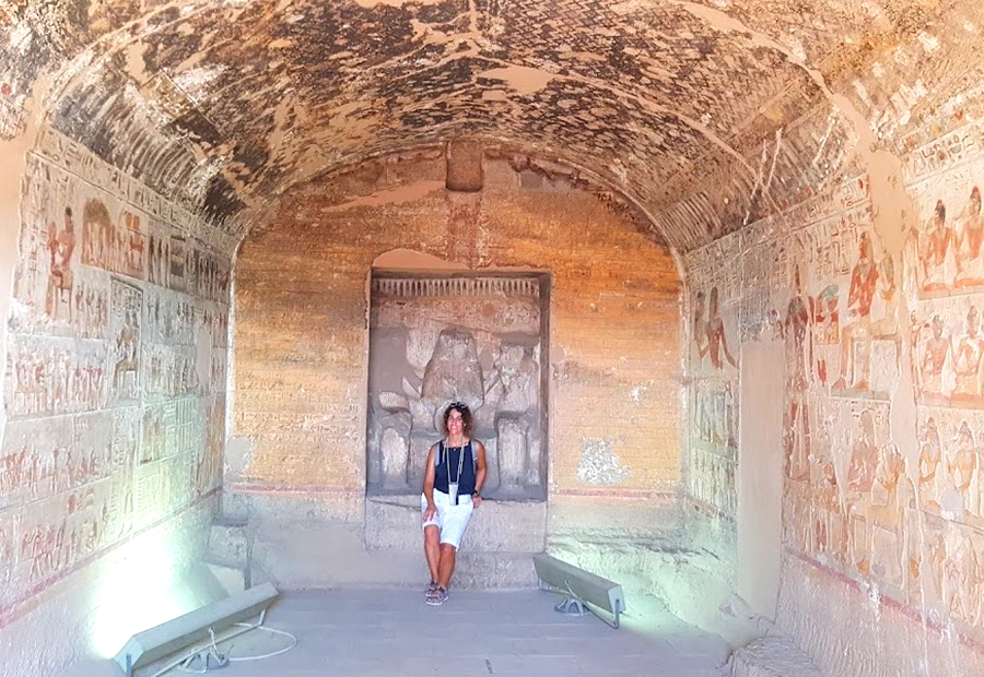 Nos pareció muy interesante también la tumba del gran sacerdote Petosiris, erigida a unos cuantos metros de las catacumbas. En contra al modelo habitual de las tumbas egipcias que suelen ser subterráneas o hipogeas, ésta se asemeja a un pequeño templo. Fue construida en el siglo IV a.C., en época ptolemaica, y son muy ilustradoras sus pinturas murales sobre la vida cotidiana de la época.