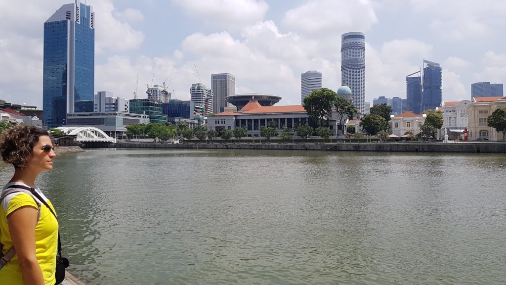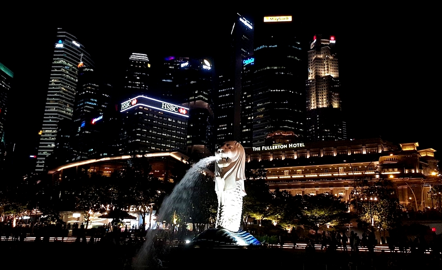 Entre los rascacielos y el límite de la bahía podemos encontrar una fuente muy curiosa. Se trata del Merlion, una estatua un tanto kistch con cabeza de león y cuerpo y cola de pez y que se ha convertido en la mascota de la ciudad. Detrás de la estatua se levanta el famoso y elegante Hotel Fullerton, un vestigio del pasado entre el acero y el cristal de los rascacielos modernos.