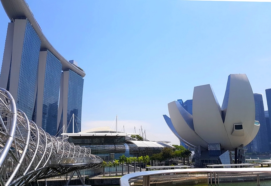 Marina Bay es el centro neurálgico de Singapur. Es el lugar que concentra más edificios emblemáticos y el sitio por donde todo el mundo acaba por pasar, locales o turistas. Se trata de un área que se ganó al mar gracias a unas obras que finalizaron a mediados de los años 90. Es una bahía prácticamente cerrada cuyo único acceso al mar es salvado por el peculiar Helix Bridge, que representa una cadena de ADN, y que conecta la Esplanade con el emblemático hotel Marina Bay Sands. Así, se forma un espléndido paseo de 3,5 Km alrededor de la bahía que vale la pena recorrer. De hecho sirve de pista para correr para muchos lugareños.