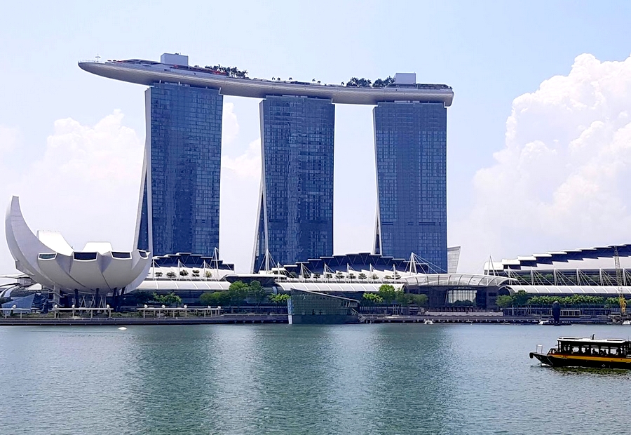 El imponente hotel que domina la bahía es el Marina Bay Sands. Se trata de una elegante construcción de 2010 que tiene 2500 habitaciones en sus tres torres de 55 plantas. La terraza es una espectacular plataforma en voladizo, el Sky Park, que alberga un observatorio público, un restaurante, un par de bares y la piscina elevada más grande del mundo, de 150 m. El observatorio y el bar son públicos, no es necesario hospedarse para disfrutarlos, y tomarse una cóctel al atardecer en una de sus terrazas es una experiencia inolvidable. A los pies del hotel podemos encontrar un centro comercial gigante, un casino, seis restaurantes, un par de centros de convenciones, dos teatros y un museo de arte y ciencia alojado en un curioso edificio en forma de flor de loto. Hay una esplanada con gradas desde donde se puede ver un espectáculo de luces láser y fuentes de colores cada día a las 20:00 y a las 21:00h. (Para acceder al Sky Park, dirigíos a la recepción de la torre 3. Ahí os darán una tarjeta para subir en el ascensor al piso 57 previo desembolso de 20 SGD, consumición mínima).