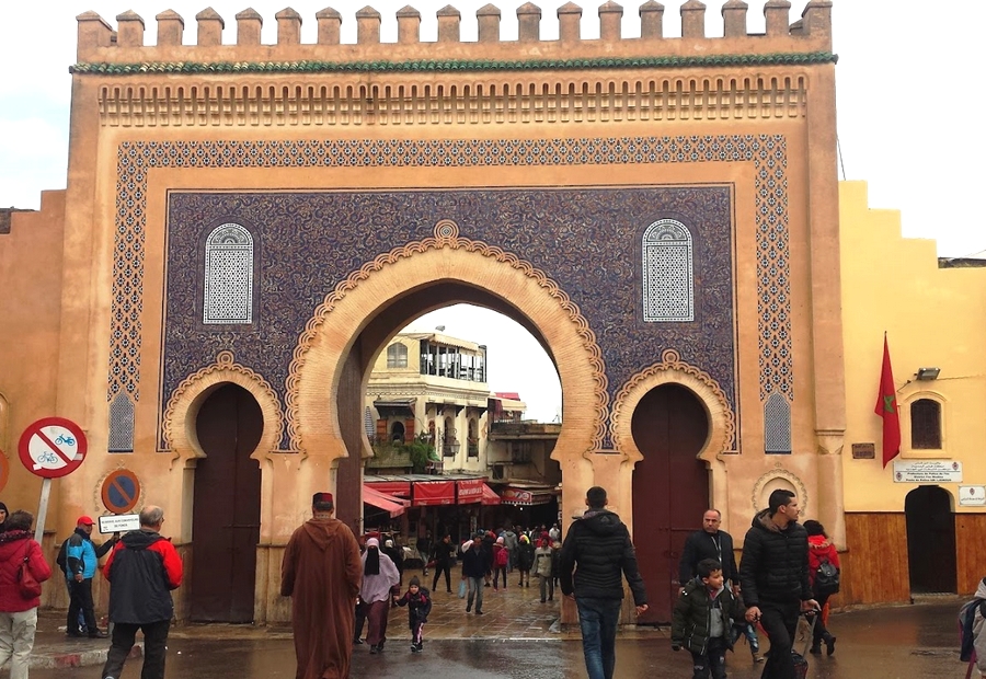 La antigua medina de Fez estaba rodeada por una muralla (aún se puede ver en la actualidad en muchos tramos) y existían puertas para entrar y salir de ella. La más importante y principal aún hoy es la Puerta Azul. Denominada en árabe Bab Bou Jeloud (Bab significa puerta, os vais a encontrar con esta palabra numerosas veces) fue construida durante la época colonial francesa a principios del S.XX y sirve como punto de partida de avenidas, principal acceso a la Medina, y concentra en su explanada interior numerosos restaurantes. Y su triple arco y su fachada cubierta de arabescos y azulejos (azules en el exterior, verdes en el interior) forman una de las imágenes más reconocidas de la ciudad.