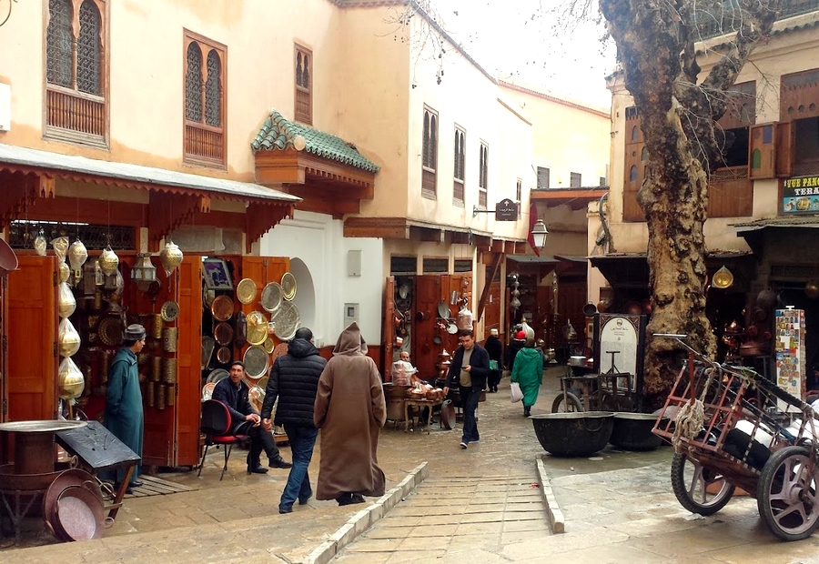 La antigua Medina se divide en varias zonas, cada una con su zoco o mercado dedicado a alguna actividad artesana. Así encontramos el Zoco Attarine, en el centro de la Medina, cubierto y conformado por varios corredores que se entrecruzan y que está dedicado a las telas y ropas, el de la Henna, al final de Tala’a Kebira está dedicado a los perfumes, aceites y al famoso argal, el remedio local para todo. El Nejjarine es el de los carpinteros y artesanos de la madera, el Achebine, cerca de la puerta azul que vende gallinas y otras aves vivas y carne al corte, y el de la bonita Plaza Seffarine, cerca de la curtidurías, que personalmente fue el que más nos gustó es el de los caldereros y artesanos de cobre y bronce, uno de los oficios más antiguos y tradicionales de Fez. Las tiendas, que venden espejos, utensilios de cocina, lámparas y artesanía, son de las más bonitas de la Medina.