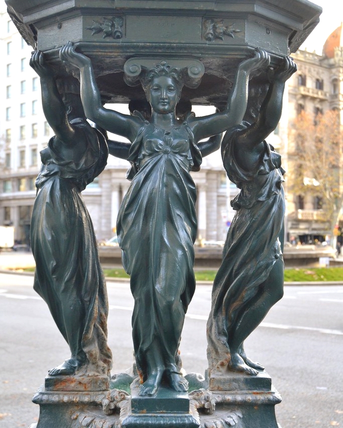 Al 1872, el filantrop britànic Richard Wallace va encarregar un disseny singular d’ una font de ferro colat a l’ escultor Charles Lebourg. Aquest va escuplir una majestuosa i delicada font amb quatre cariàtides (fixeu-vos que són totes diferents) que sostenien mig orbs decorat amb quatre peixos. Wallace va anant regalant la seva font a les ciutats en fires (París en té encara avui 102 exemplars), i al 1888 va donar 12 unitats a la ciutat de Barcelona. Malauradament, ja només en podem veure dues, i algunes còpies més o menys maldestres, com una que hi ha a la part alta de La Rambla o una altra al Parc de la Ciutadella.