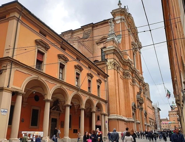 Si llegáis a Bolonia en avión, lo más práctico para desplazarse hasta la ciudad es el tren semidirecto Marconi Express. Es muy rápido y cómodo, aunque no demasiado barato (17 € ida y vuelta en Marzo de 2022) pero siempre es más económico que un taxi. El tren deja en la Estación central y para llegar al centro sólo tenéis que tomar la Via dell’ Indipendenza, una señorial avenida donde ya nos encontramos con los primeros pórticos y que, tras cruzar los restos de las murallas y la antigua puerta de la ciudad, discurre entre hoteles de lujo y tiendas de marca. Casi al final de la avenida, a mano izquierda, aparece imponente la Cattedrale Metropolitana di San Pietro, la catedral de la ciudad para los boloñeses. Sus obras finalizaron en el S XV en estilo barroco y su campanario, de 70 metros, es una de las torres más altas de la ciudad (de las que hablaremos más adelante). Se puede subir al campanario en horas concretas y también bajar a las catacumbas donde se pueden contemplar vestigios de las primeras construcciones.