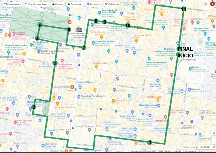 Para acabar, proponemos una ruta para conocer bien el Centro Histórico. La distancia propuesta es de 5 Km, que se haría en una hora más o menos, pero si contamos las paradas nos puede ocupar una mañana o una tarde entera. La salida y la llegada están en el Zócalo, delante de los soportales de Mercaderes.