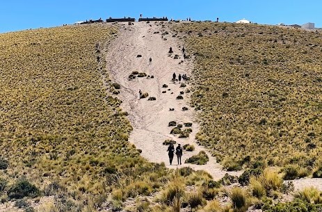 En realidad, fue mucho más fácil de lo que imaginábamos, ya que nada más bajar del colectivo de línea en la estación de buses de Humahuaca, nos abordaron unos lugareños preguntando si queríamos subir al Cerro de los 14 colores (¿sería por nuestra pinta de guiris?). Así que, tras pagar unos 10 € y esperar un ratito, nos acomodamos en un 4×4 que al momento salió de la población y enfiló un camino de ripio que empezó a estrecharse y a subir. La subida a la Serranía del Hornocal resultó una delicia, un poco traqueteante, eso sí. El camino ascendía entre pastos verdes donde retozaban las elegantes vicuñas salvajes (entendimos por qué su lana es la mas cara: a ver quien es el esforzado que sube hasta aquí a intentar esquilarlas…) y serpenteaba en curvas cada vez más pronunciadas. Y tras una hora de subida en la que alcanzamos los 4350 m.s.n.m, por fin llegamos.