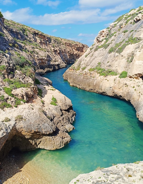 Tras abandonar Victoria nos planteamos ir hacia la costa oeste de Gozo, la más agreste de todo Malta y que en tiempos fue un punto turístico importante ya que la gente acudía en manada a hacerse fotos en la Azure Window, un delgado arco de roca erosionado por el mar. Pero ¡Ay! en 2017 una fuerte tormenta se lo llevó por delante y ya sólo quedan los restos del pilar y las grandes piedras bajo el agua. Asi que nos decantamos por una maravilla natural, el cañon Wied Il Ghasri. Se trata de una sinuosa entrada de agua del mar que es muy frecuentada por submarinistas y practicantes de snorkel y a la que llegamos tras un breve paseo después de dejar el coche en el aparcamiento. Lástima que acabara de llegar una excursión de chinos que se dedicaron a tirar piedras al agua. Pero se fueron tras sacar las correspondeientes fotos y pudimos disfruar del espectáculo natural con tranquilidad.
