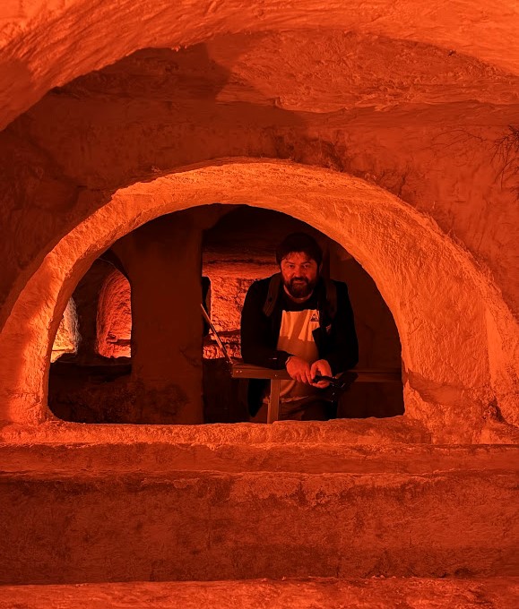 Ya con el estómago contento nos dirigimos al Hipogeo de Hal Safieni con pocas expectativas de lo que íbamos a ver. Nos sorprendió el hecho de que estuviera en plena ciudad, cuando uno se imagina un templo hipogeo excavado en un montaña o en una cueva natural. Así que, tras ajustarnos las pantuflas de plástico para no dañar las milenarias instalaciones, pasamos al audiovisual que nos explicó que el complejo se descubrió hacia 1900 cuando un vecino agujeraba su sótano para instalar una cisterna de agua. Y por el hueco accedió de manera inesperada a una inmensa sala excavada en la roca.