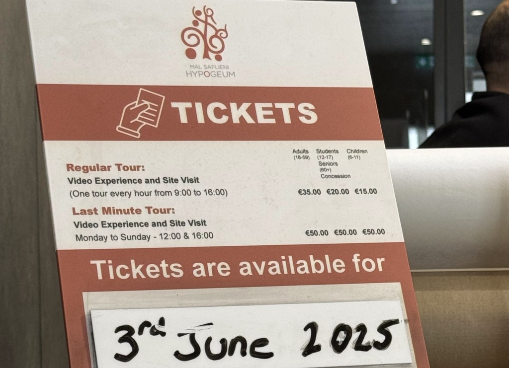 El segundo día tocaba despertarse prontito porque queríamos ser los primeros en la cola para algo que se nos antojaba imprescindible. En un alarde de imprevisión, al acceder a la web para comprar entradas para el Hipogeo de Hal Safieni nos llevamos la bonita sorpresa de que no había tickets disponibles… ¡hasta dentro de tres meses! Pero tras los primeros momentos de desesperación descubrimos que no todo estaba perdido: leímos en un blog que cada día a las 9 de la mañana se ponen a la venta tan solo 20 entradas para el día siguiente en el Fuerte Saint Elm en La Valetta (en las propias taquillas del Hipogeo también, pero es a partir de las 10 y siempre quedan agotadas a las 9 en Saint Elm) Así que a as 8:45 ya estábamos en la cola en el puesto número tres con el éxito garantizado.