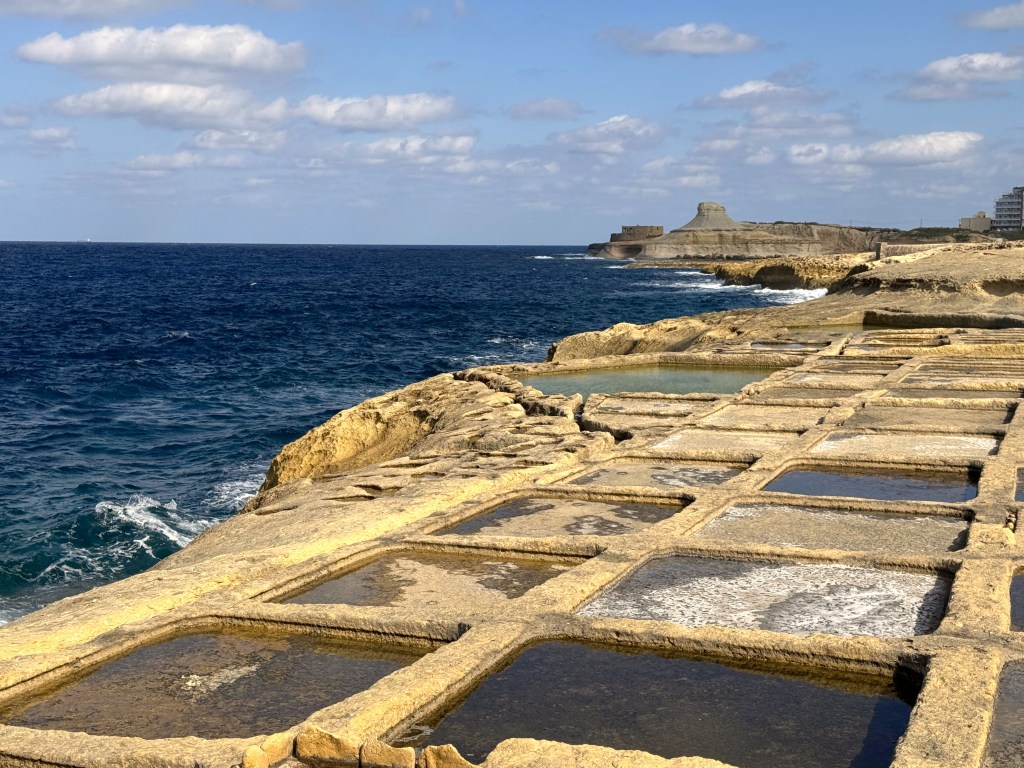 Siguiendo la costa hacia el este nos aguardaba nuestra siguiente visita, las Salinas de Zeebug (en su nombre vernáculo, Xwejni salt pans) Hubiéramos podido ir a pie porque estan muy cerca del cañon, pero el coche nos dio más agilidad de movimientos. Se trata de más de un kilómetro de excavaciones en la roca de la playa que sirven para recoger la sal del mar tras la evaporación del agua por la acción del sol y que aún hoy en día están en perfecto funcionamiento. Y que, con las baterías defensivas británicas que aûn se conservan, conforman un lugar muy fotogénico. Y muy poco visitado, por cierto.